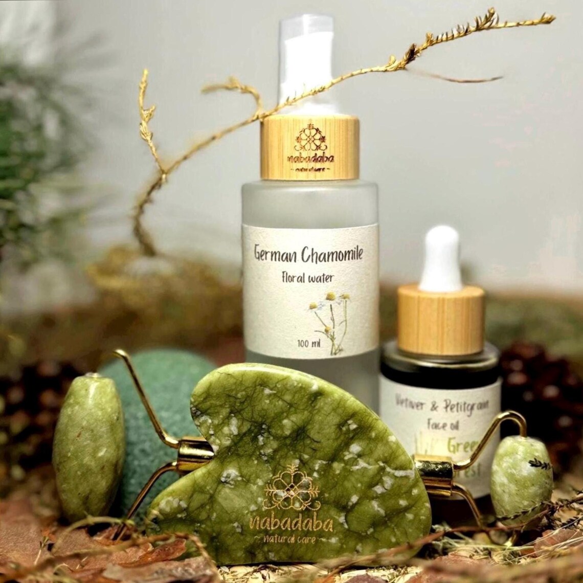 Unwind and glow ✨ with our Calming Facial Massage Gift Set, designed to elevate your skincare routine through the power of natural, organic ingredients and ancient self-care tools. This all-in-one facial ritual kit promotes skin rejuvenation, improves circulation ♀️, and encourages a natural glow—making it perfect for dry, mature, dehydrated, or tired skin types.nnEach set includes a soothing floral water (your choice of Chamomile, Linden Blossom, or Lemon Verbena), a nourishing blend of Vetiver & Petitgrain facial oil, a natural konjac sponge, and a Jade Gua Sha tool with matching roller to complete your facial massage ritual.nnCrafted with high-quality organic ingredients and sustainably packaged, this set makes a thoughtful gift or a personal treat. Use it regularly to reduce puffiness, improve skin tone, and create peaceful moments in your day ️