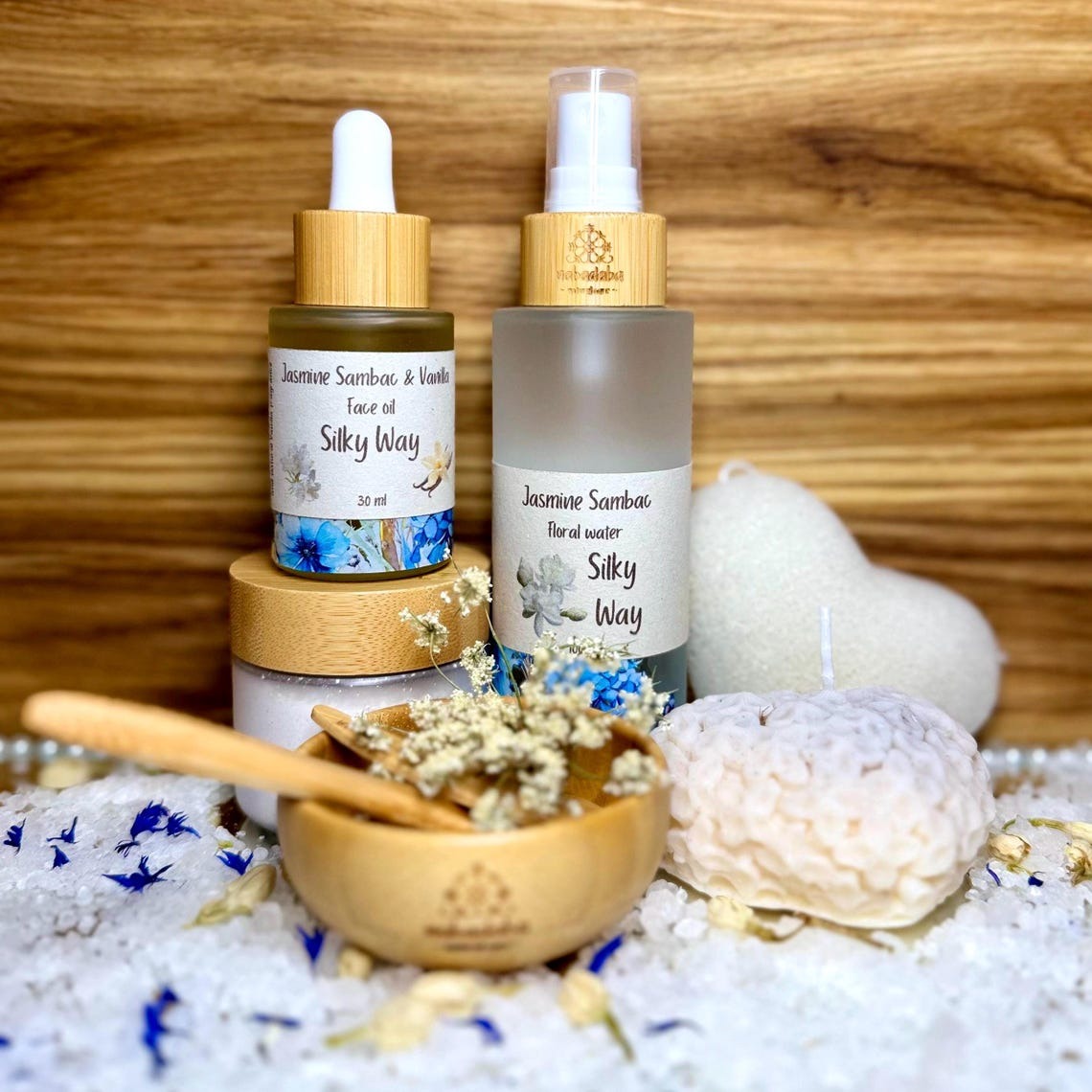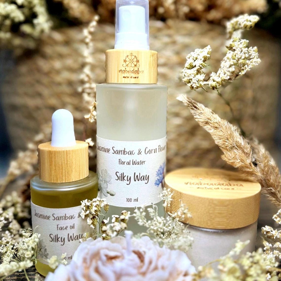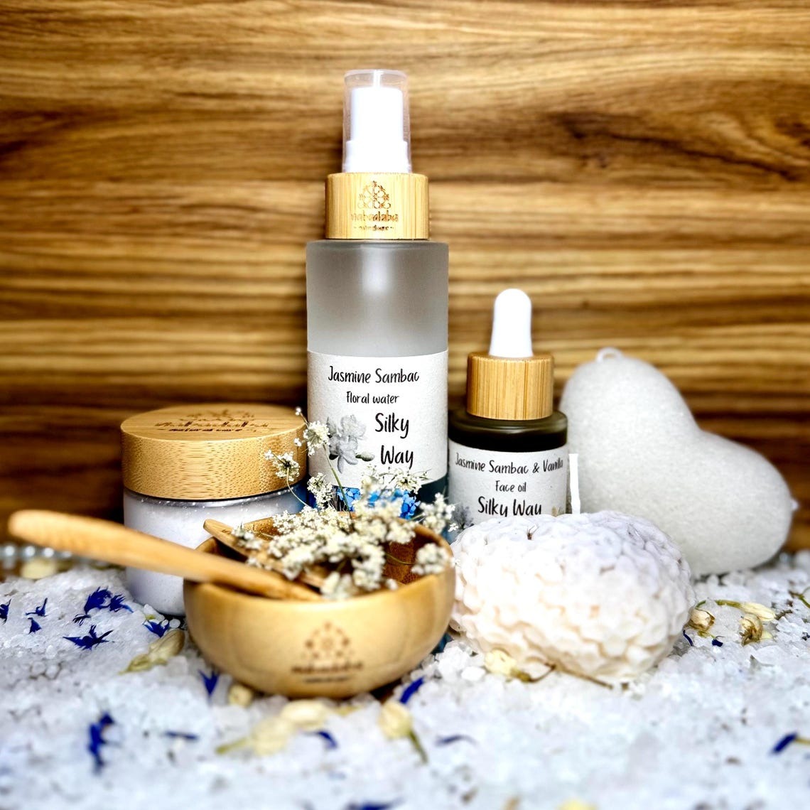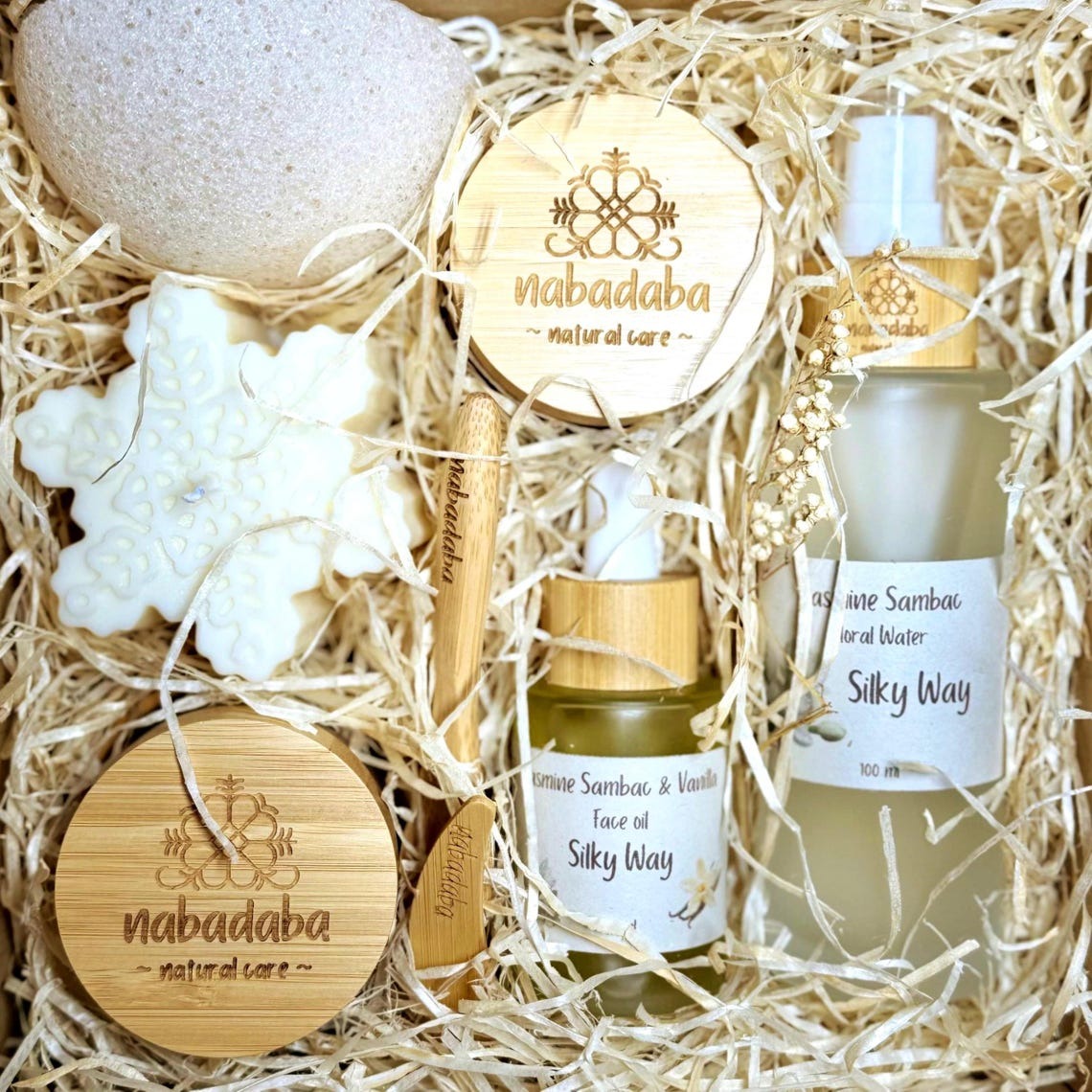 A Delicate Ritual for Radiant, Nourished Skin – Ideal Gift for HernnInspired by the exquisite scent of Sampagita (Jasmine Sambac), this feminine and luxurious face spa set is crafted to gently nourish, soothe, and rejuvenate fragile, dry, or mature skin. Treat yourself – or someone special – to a self-care ritual filled with floral elegance and botanical purity.nn What’s Inside:n• White Kaolin Clay Mask (25g) – Blended with orris root, vanilla bean, and colloidal oatmeal for the gentlest exfoliation.n• Floral Mist (100ml) – Jasmine Sambac and Cornflower water to tone, calm, and hydrate.n• Jasmine & Vanilla Face Oil (30ml) – Featuring Macadamia, Argan, and Prickly Pear oils, luxuriously scented with Jasmine and Vanilla.n• Konjac Sponge – Soft exfoliation for all skin types.n• Bamboo Bowl, Spatula, and Spoon – Natural tools to complete your spa ritual.nn ♀️ 5-Step Silky Ritual:n1. Cleanse with the Konjac Sponge and warm water.n2. Tone with your floral water mist.n3. Detox with the White Kaolin Mask — mix for a creamy texture and apply.n4. Rinse gently and pat dry.n5. Nourish your skin with 2–3 drops of the Jasmine & Vanilla Face Oil for a glowing, velvety finish.nUse this calming ritual 1–2 times weekly to keep your skin soft, radiant, and deeply cared for.nn Key Benefits:n• Soothes fragile or mature skinn• Deeply hydrates and softensn• Sensory indulgence with floral, warm notesn• Vegan, cruelty-free, and eco-conscious