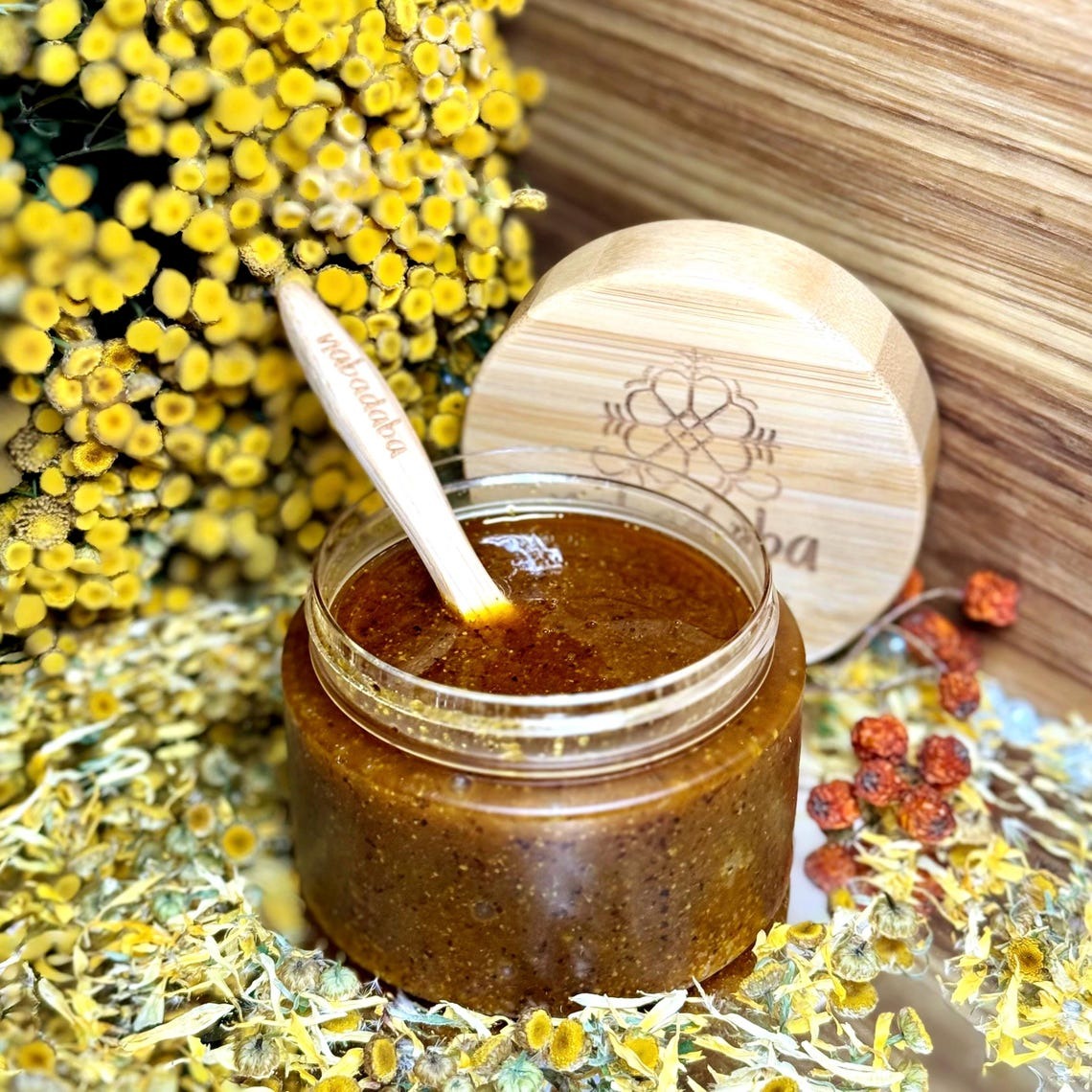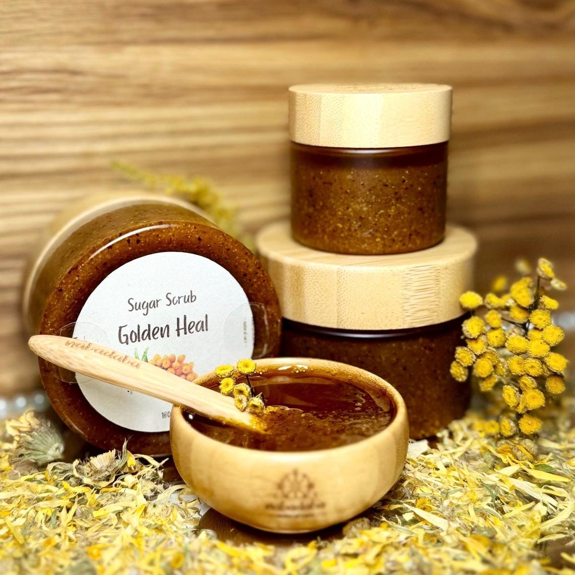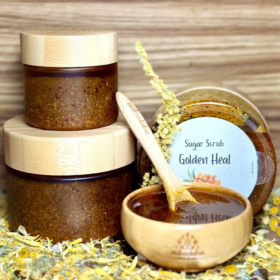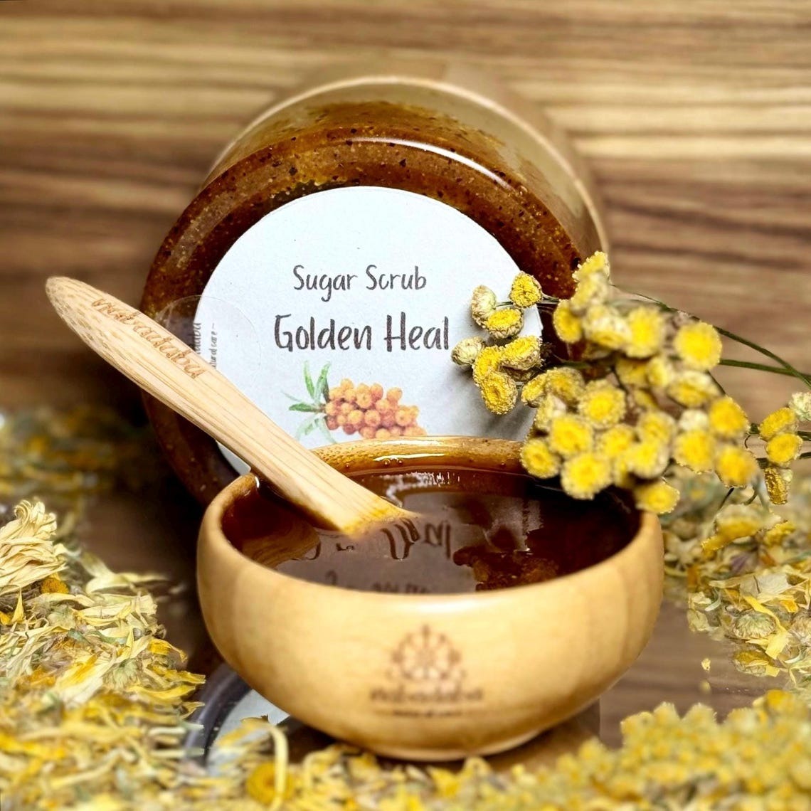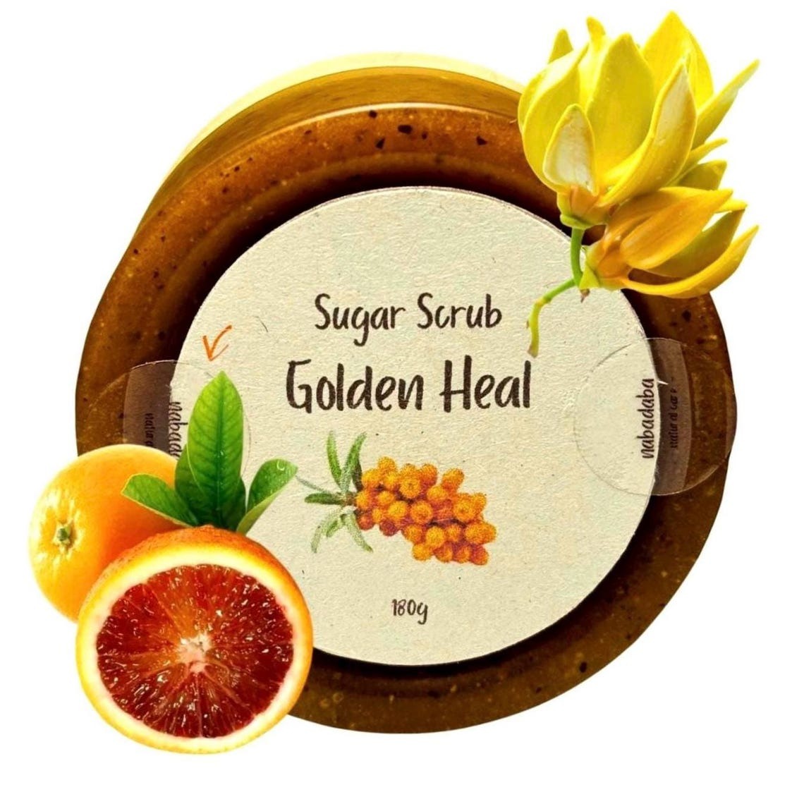 Treat your skin with care – and nature’s goodness – with our Golden Heal Sea Buckthorn Sugar Scrub, a luxurious exfoliant handcrafted from organic brown cane sugar, sea buckthorn infusion, and sea buckthorn powder for added antioxidant – rich nourishment. This gentle scrub polishes and softens your skin while honoring your commitment to clean, eco-friendly skincare.nnInfused with orange and ylang-ylang essential oils, this vibrant scrub uplifts the senses and leaves your skin feeling fresh, smooth, and nourished – naturally. Every batch is lovingly handmade in small quantities to support both your wellness and the planet.nn Why You’ll Love It:n• Powered by organic and natural ingredientsn• Gentle exfoliation with botanical oilsn• No synthetic fragrances or preservativesn• Earth-conscious & skin-kindn• Perfect for clean beauty lovers & giftingnn How to Use & StorenTo avoid contamination, scoop a portion (one-third to one-half) into a clean bowl before use. This helps protect the remaining scrub from water and keeps it fresh longer.