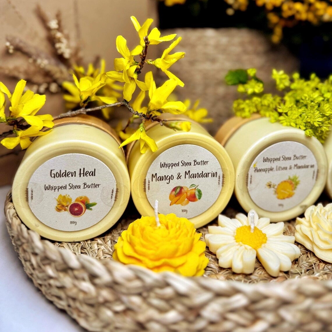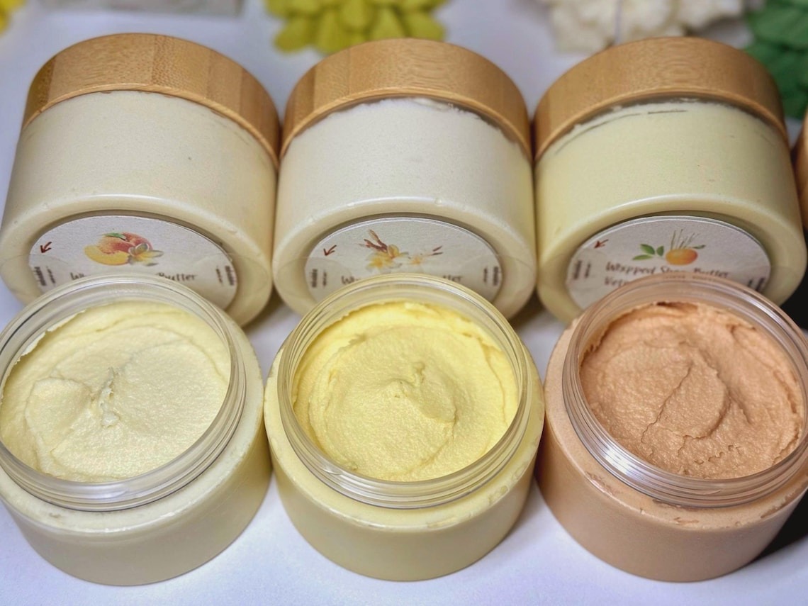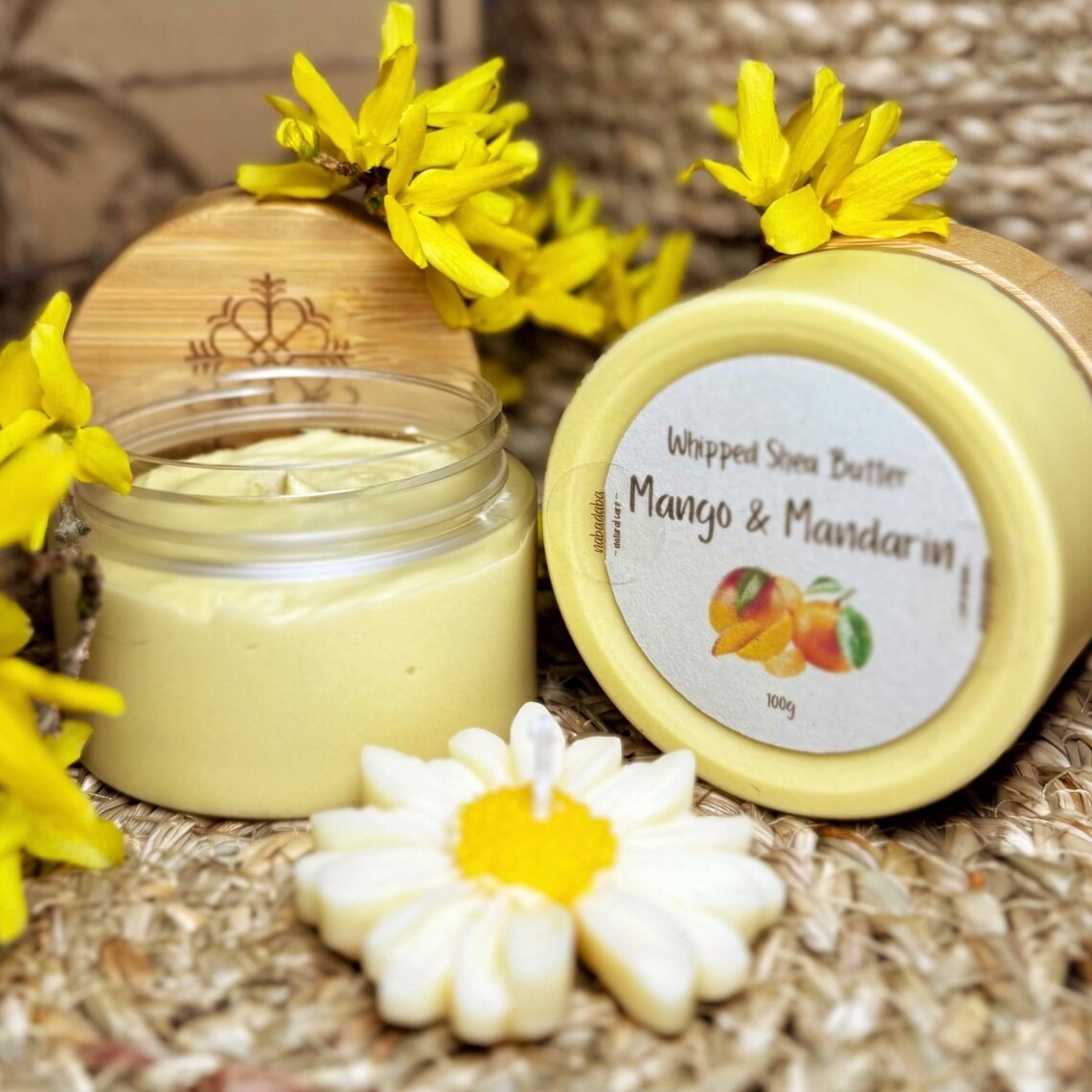Whipped Organic Shea Butter – Luxurious, Nourishing, and Naturally Scented for Glowing Skin nnPamper your skin with our ultra-rich, whipped organic Shea butter, infused with skin-loving Calendula and Sea Buckthorn oils. This creamy, nourishing blend is packed with vitamins, antioxidants, and unsaponifiables to deeply hydrate, soothe, and restore your skin’s natural glow.nnPerfect for dry, sensitive, or irritated skin – or simply as your daily indulgence!nn✨ Choose from 3 Heavenly Scents:nAll made with pure essential oils and natural fragrances, no synthetic additives.nn Ylang-Ylang, Orange & Patchouli – Floral, warm, and sensuousn Orange & Apricot – Sweet, juicy, and fruityn Mandarin & Mango – Tropical and upliftingnn Available in Eco-Friendly Packaging Options:nChoose your perfect size and sustainable container:n100g (3.5 oz) PET jar with elegant bamboo lidn60g (2.2 oz) Glass jar with bamboo lidn70g (2.5 oz) Aluminum tin jarn40g (1.4 oz) Compact aluminum tin jarnnAll packaging is plastic-reduced or recyclable, and shipped with eco-conscious materials for safe and sustainable delivery.nn Clean, Simple Ingredients – 100% Natural & Organic:nnYlang-Ylang, Orange & Patchouli:nOrganic Shea Butter (Ghana)nSea Buckthorn infused Olive OilnCalendula infused Sunflower OilnYlang-Ylang, Sweet Orange, and Patchouli Essential OilsnVitamin EnOrganic Bisabolol (soothing plant extract)nnOrange & Apricot:nOrganic Shea Butter (Ghana)nSea Buckthorn infused Olive OilnCalendula infused Sunflower OilnSweet Orange Essential OilnNatural Apricot FragrancenVitamin EnOrganic BisabololnnMandarin & Mango:nOrganic Shea Butter (Ghana)nSea Buckthorn infused Olive OilnCalendula infused Sunflower OilnMandarin Essential OilnNatural Tropical Mango FragrancenVitamin EnOrganic Bisabololnn Why You’ll Love It:n✔ 100% Natural & Organicn✔ Rich in Antioxidants & Vitamins A, E, and Cn✔ Soothes irritation & supports skin regenerationn✔ Non-greasy, melts into your skinn✔ Handmade in small batches with loven✔ Eco-conscious packagingnnPerfect as a face moisturizer, body butter, or after-sun balm – or gift it to someone who deserves a little luxury.nn✨ Add to your cart and treat your skin to the care it deserves! ✨