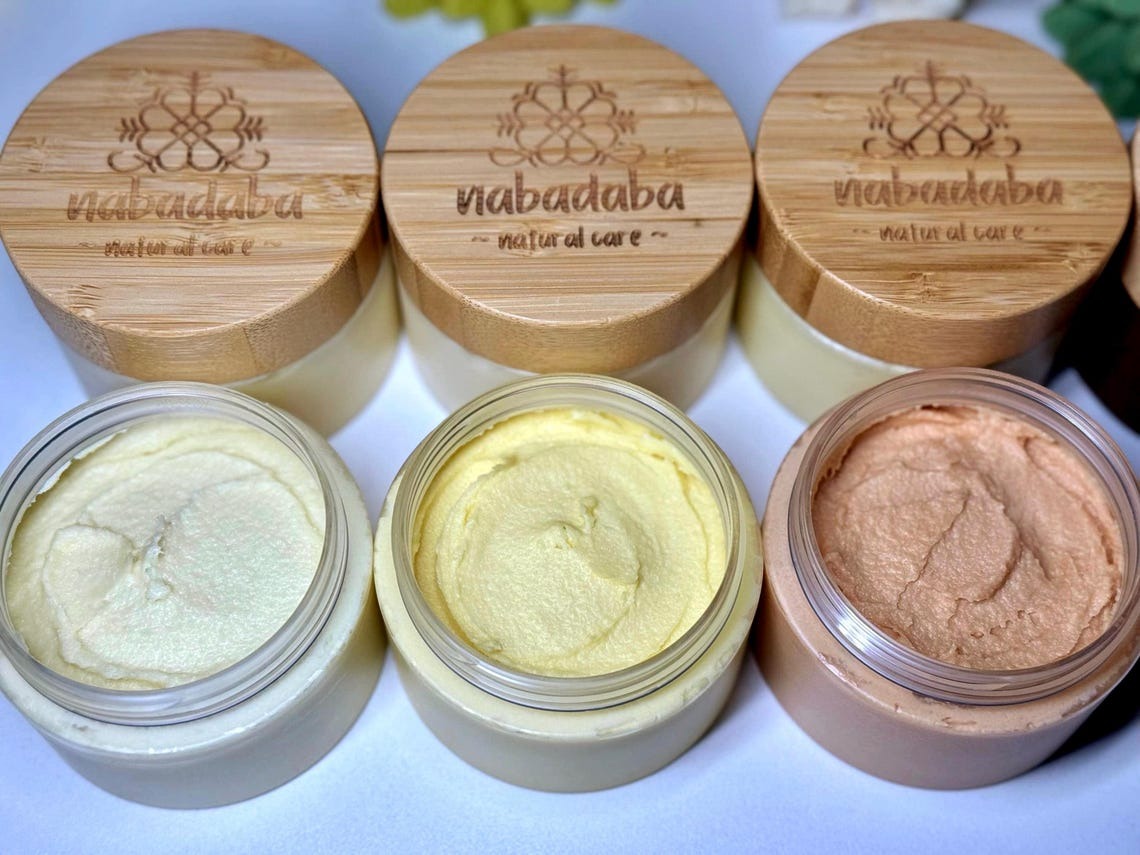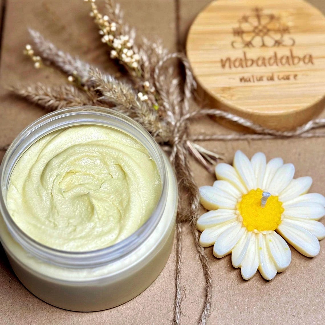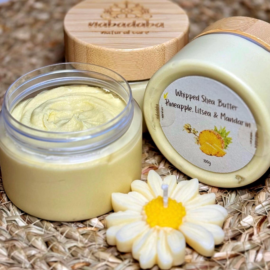 Organic Whipped Shea Butter with Aloe Vera & Avocado + Natural Essential Oil Scents | Nourishing Body Butter in Eco-Friendly PackagingnnDiscover the perfect balance of organic unrefined shea butter, aloe vera infusion, and virgin avocado oil, whipped into a creamy, rich body butter that nourishes and protects your skin naturally. Choose your favorite from four refreshing scent blends crafted from pure essential oils and natural aromas.nn Available Scents:nPineapple, Litsea & Mandarin – Fruity, fresh, and greennLitsea, Mandarin & Lemongrass – Sweet, citrusy, and upliftingnVetiver, Petitgrain & Mandarin – Earthy, bitter green, calmingnLemongrass & Lime – Crisp, refreshing, vibrantnn Key Ingredients:nOrganic Virgin Shea Butter (Ghana) – Deep hydration, rich in vitamins A & EnOrganic Virgin Avocado Oil – Nourishing and antioxidant-richnOrganic Aloe Vera-Infused Sunflower Seed Oil – Soothing and moisturizingnVitamin E & Organic Bisabolol – Natural antioxidants and skin calmersnPure Essential Oils & Natural Fragrance Blends – Aromatherapeutic and refreshingnn Packaging Options:nChoose fromn100g PET jar with bamboo lid (lightweight, eco-conscious)n60g Glass jar with bamboo lid (reusable, elegant)nn Eco-Friendly Packaging:nWe care for your skin and the planet. Your shea butter is packed in recyclable jars with bamboo lids, shipped in biodegradable mailing bags and cardboard boxes with wood wool for secure, sustainable delivery.nn Custom Scents:nWant a unique scent? We offer a wide selection of natural essential oils and aromas—just ask!nn Why You’ll Love It:n100% Organic, Vegan, Cruelty-FreenNo synthetic preservatives or parabensnGentle on sensitive and dry skinnIdeal for daily moisturizing and self-care rituals